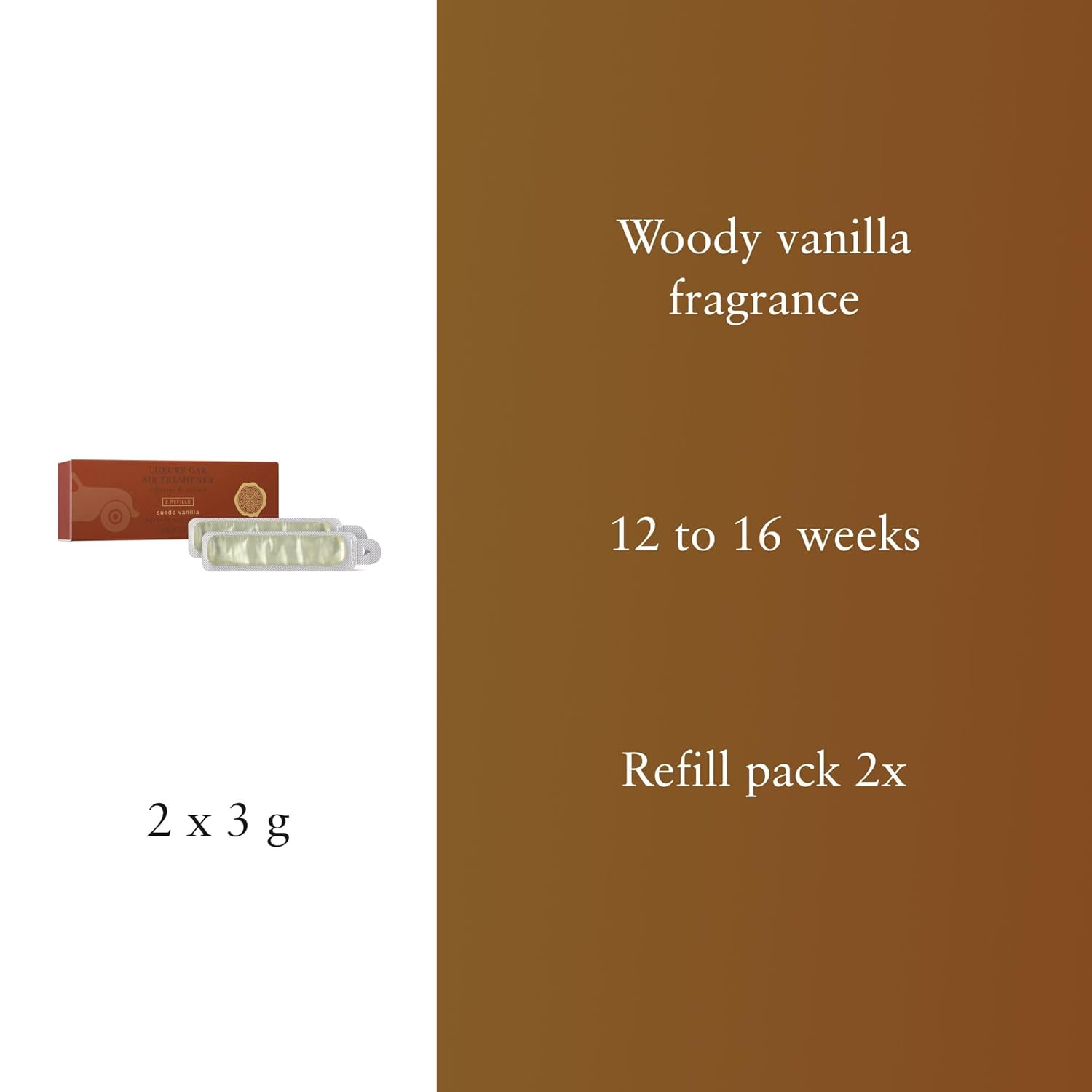 La vie est un long voyage... Appréciez-en chaque kilomètre avec ce parfum pour voiture aux senteurs sucrées et réconfortantes de vanille accompagnées de cardamome, romarin, patchouli et vétiver en notes de fond. Le parfum pour voiture dure six à huit semaines et est activé par le flux d’air de la ventilation de votre voiture. Ce parfum pour voiture est livré avec un présentoir en bois élégant facile à réutiliser avec vos éco-recharges de parfum.