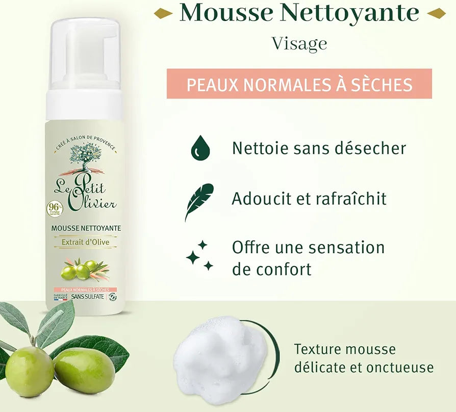 La Mousse Nettoyante Le Petit Olivier nettoie en douceur, sans assécher la peau. Grâce à sa formule sans sulfate et à 96% d'ingrédients d'origine naturelle, votre peau reste fraîche et douce. Idéale pour les peaux normales à sèches. Essayez-la dès aujourd'hui.