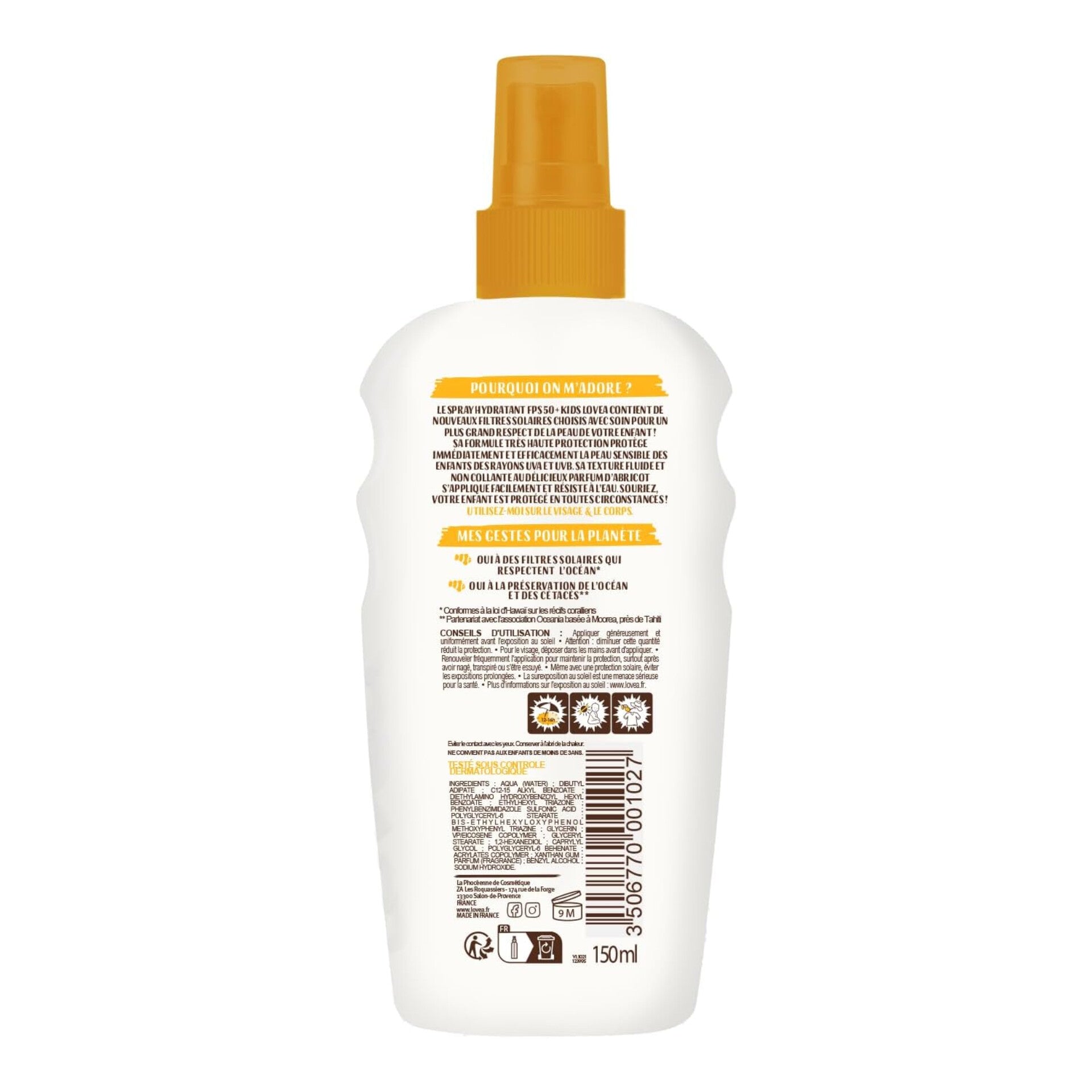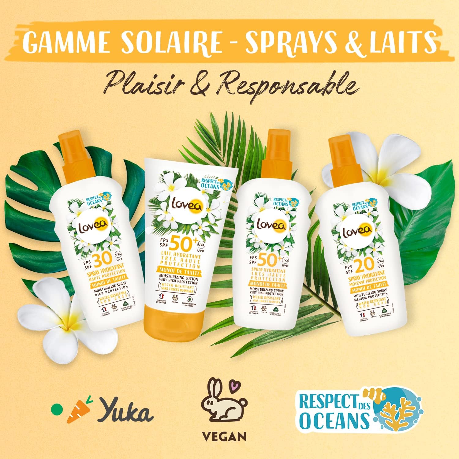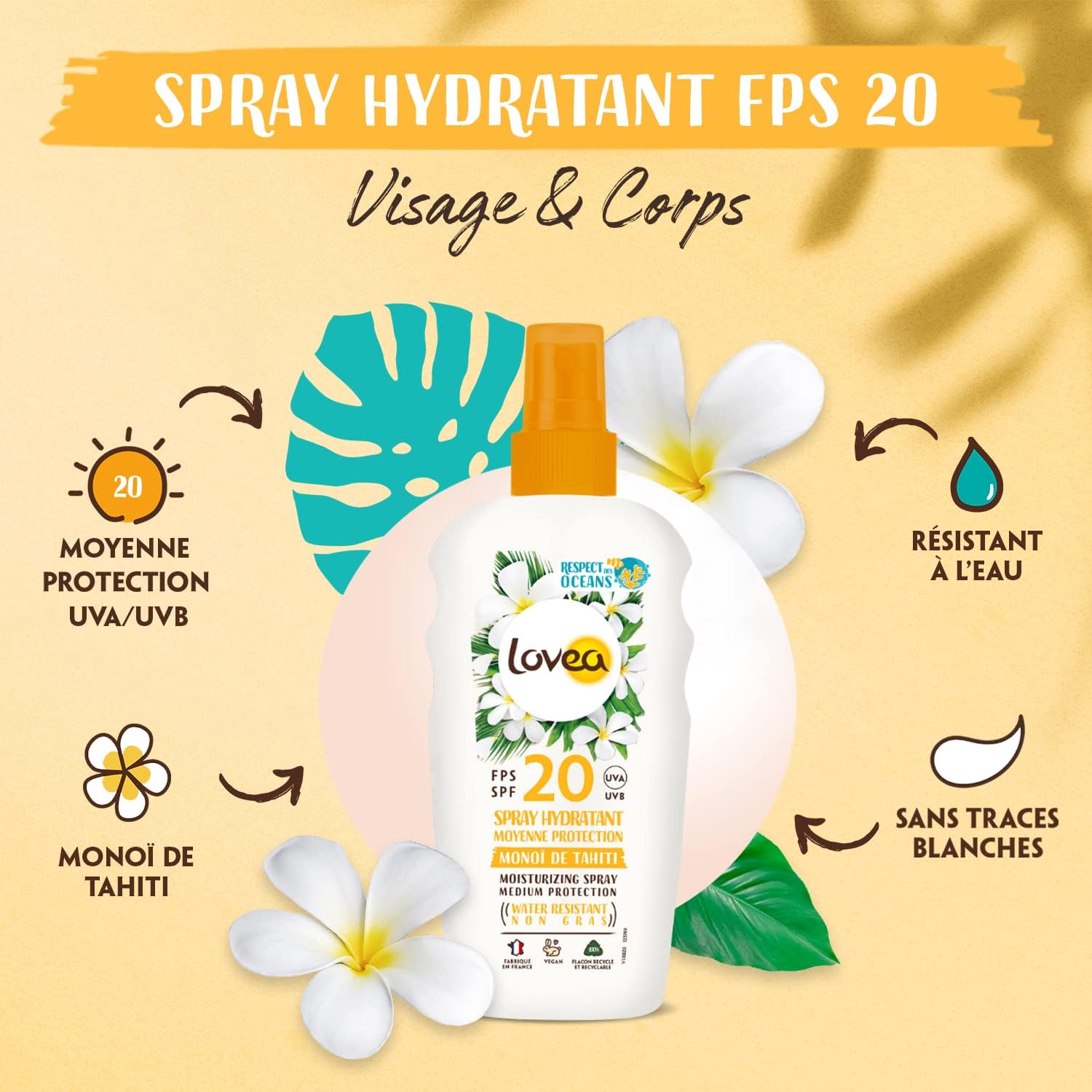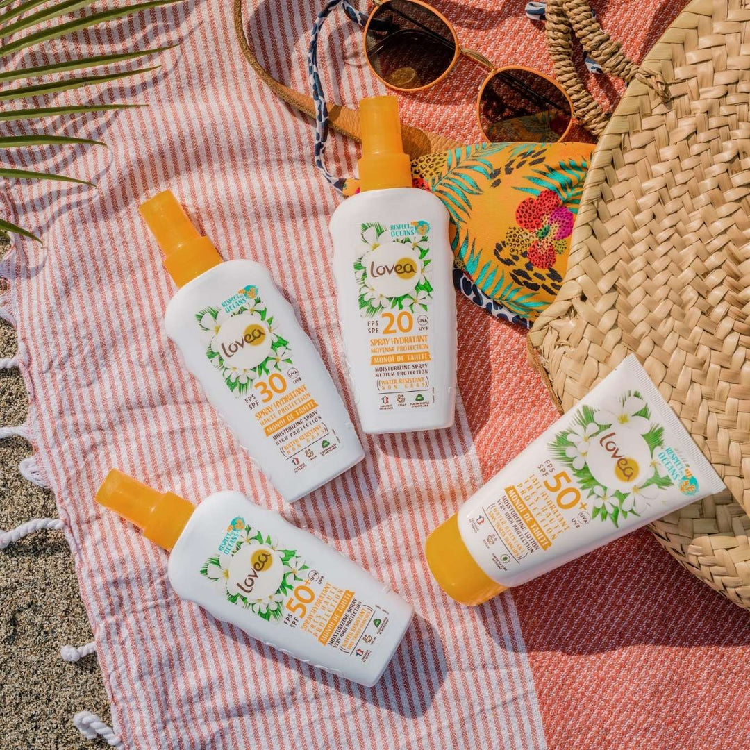 Découvrez le spray hydratant LOVEA avec une moyenne protection SPF20 au Monoï de Tahiti. Protégeant efficacement contre les rayons UVA et UVB, il offre également un bronzage progressif. Fabriqué avec des filtres solaires respectueux de la peau et des océans, votre peau sera protégée, hydratée et délicieusement parfumée. Fabriqué en France.