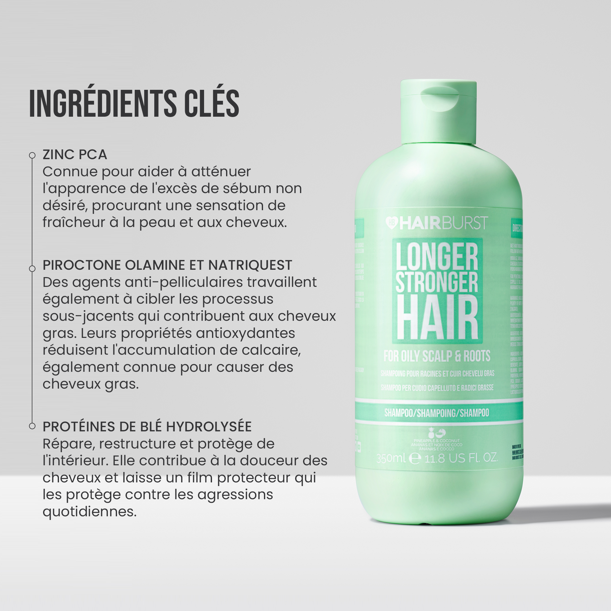 Ingrédients antipelliculaires et antistatiques pour prévenir les frisottis et la casse.